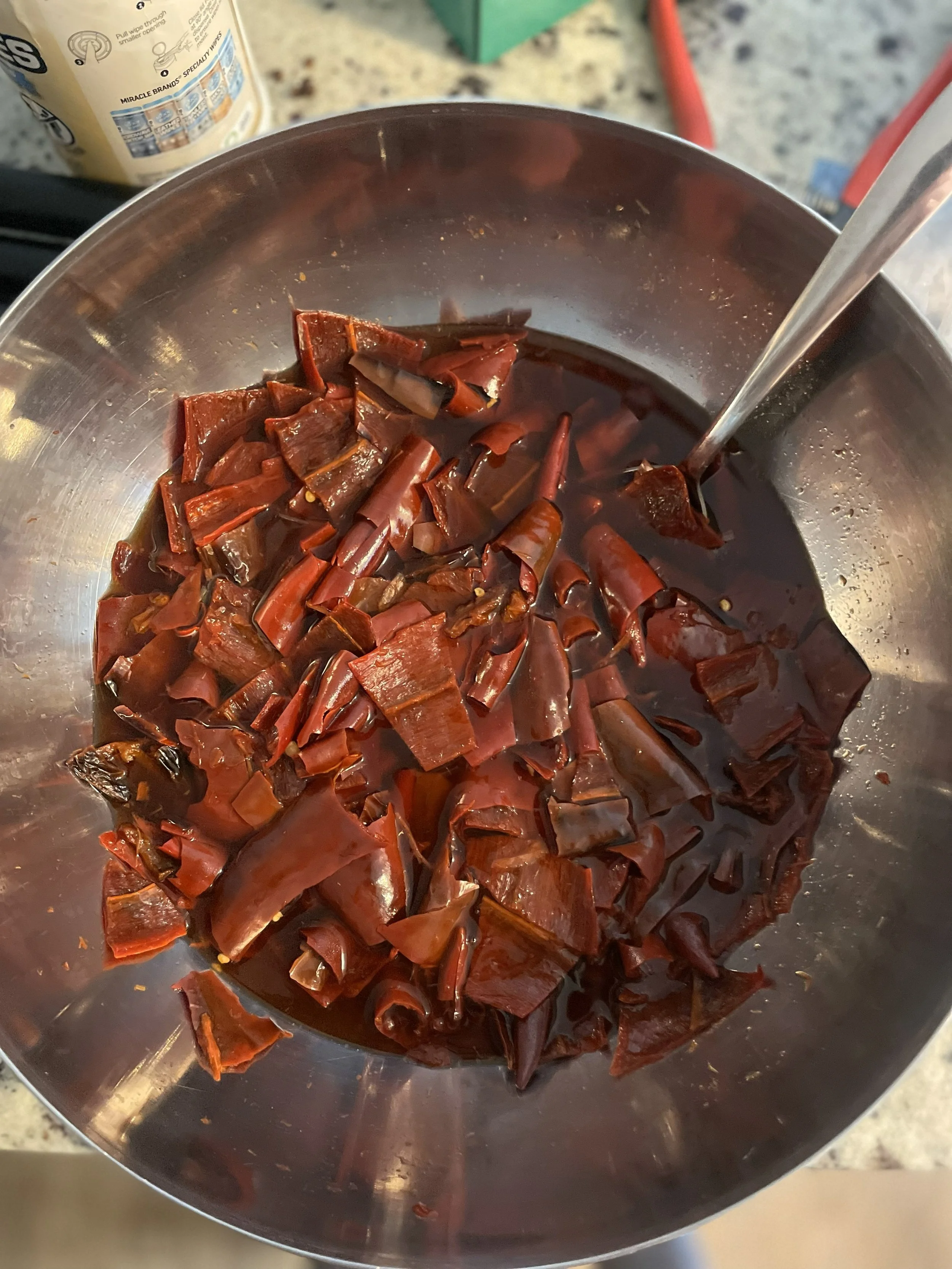 Soaking dried peppers prior to fermentation.